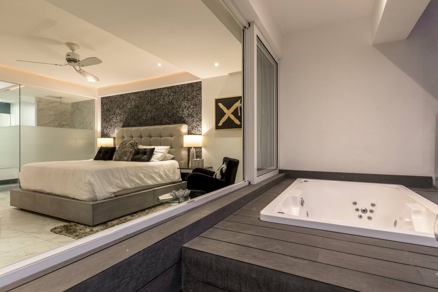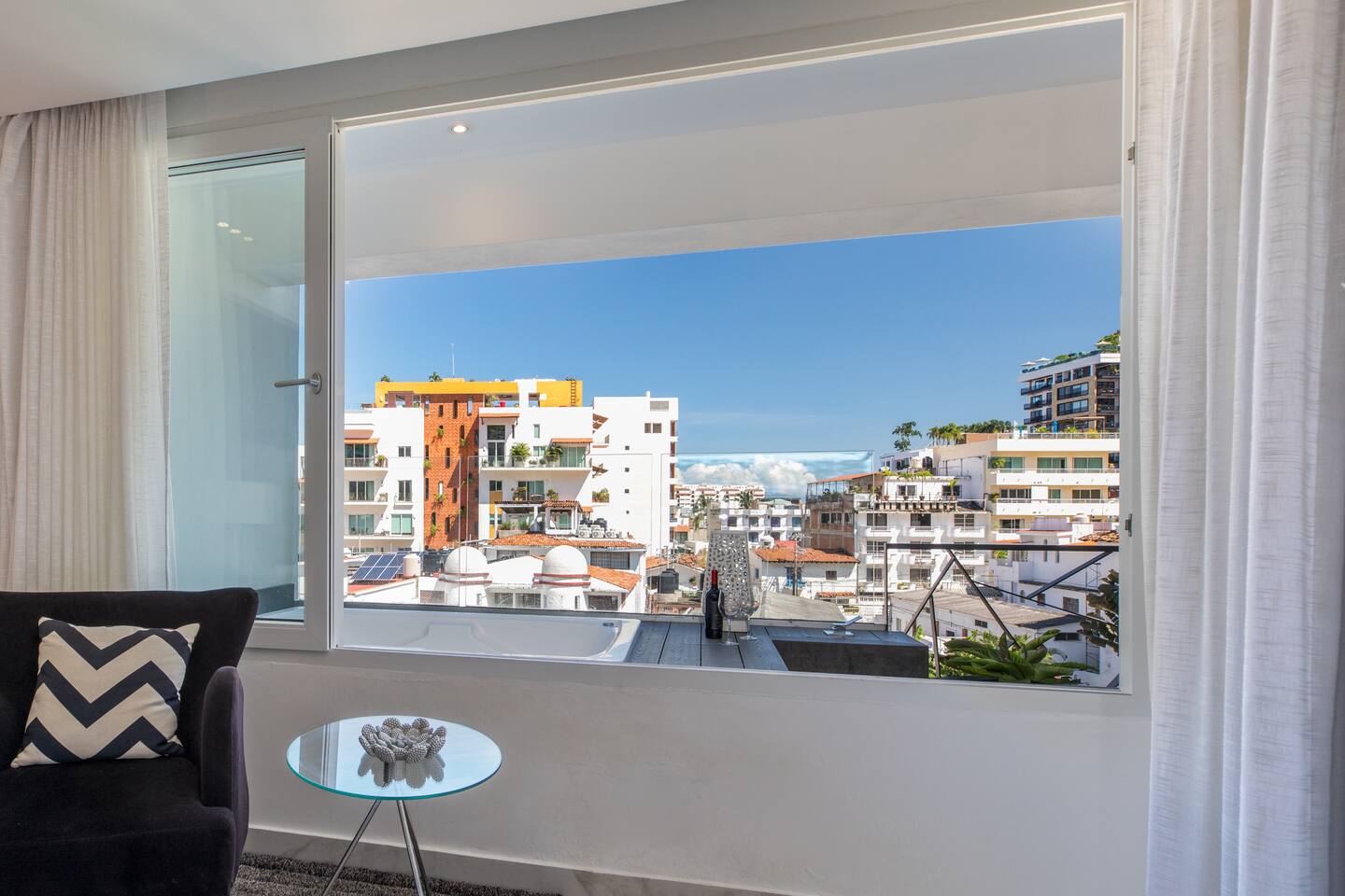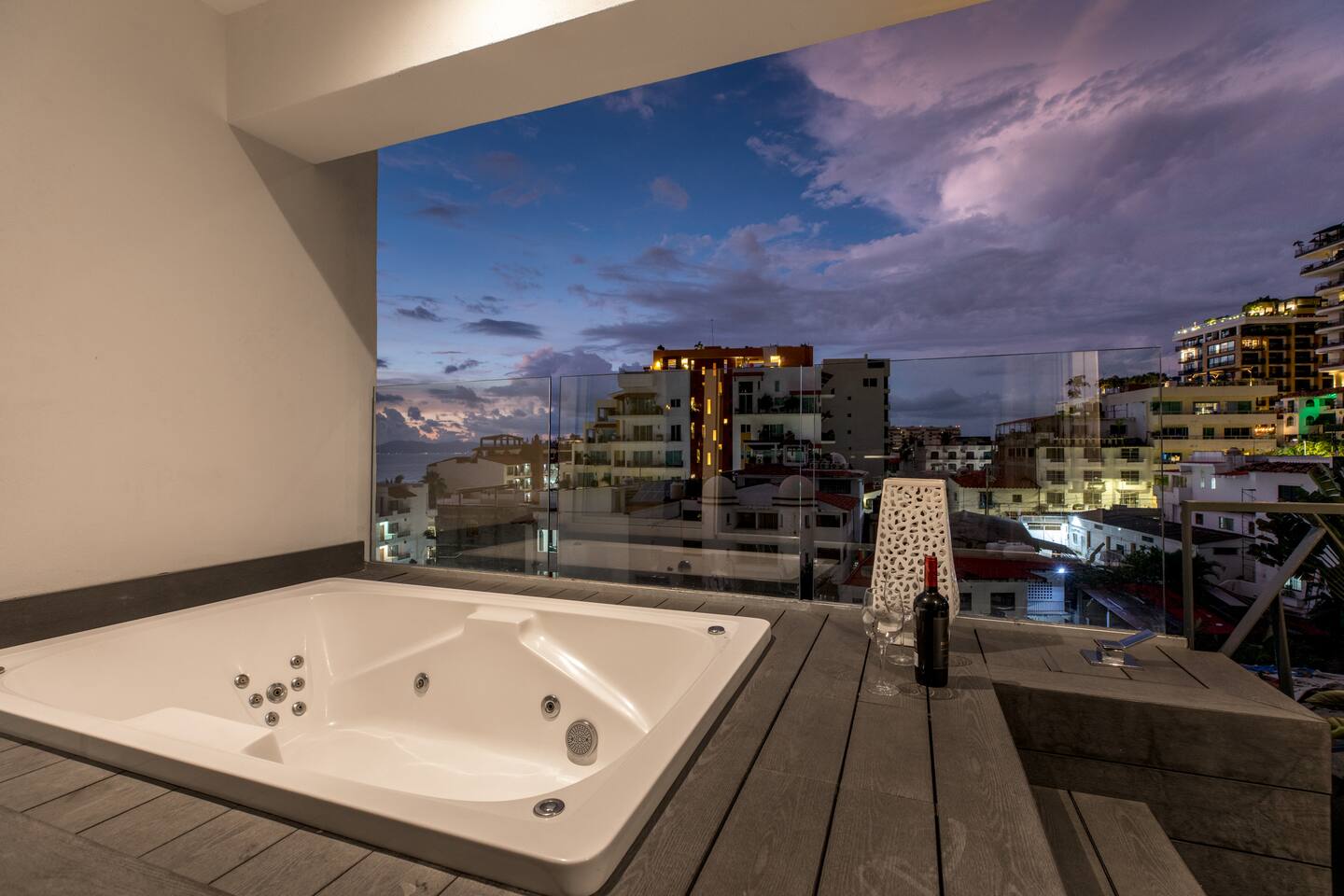 1 block from Playa Los Muertos. Winter is coming why not fly south stay warm and dry in the lap of modern luxury in the heart of Gay Vallarta. Amazing roof top views, private in room Jacuzzi, beautiful patio views, private parking space. Hidden quiet relaxation just steps away from all the local action and famous beaches. Optional Service Fees: Early Check-in 10am-2pm (subject to availability) - $100 USD VIP Black Suburban Airport Transportation One Way - $2000 MXN Pet Fee - None Parking fee - None 6 day a week cleaning - none