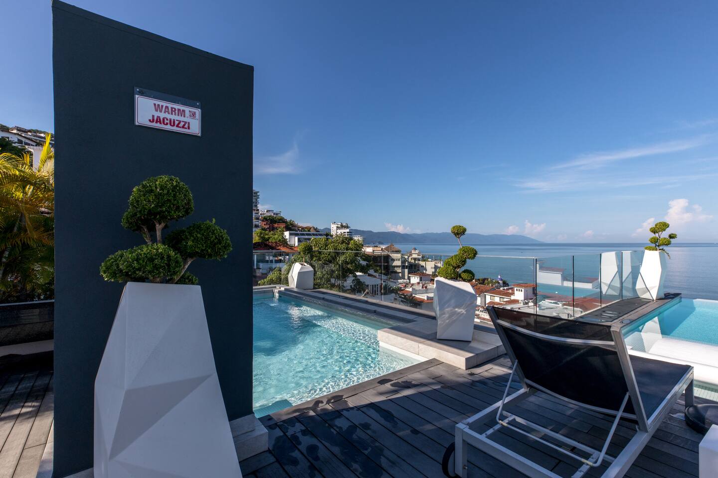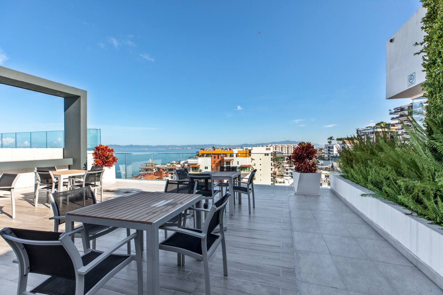 Our building is a unique design with Luxury in mind. The Lobby, Rooftop Terrace, Infinity pool, Wet bar area, Firepit, Gym, interior condo is a modern luxury design, appointments and convenances. Enjoy the romantic private balcony jacuzzi, with dimmable lighting, fan, bar and table seating to take in the sea and town views, almost nightly fireworks. Set back off the street, north facing the condo is quiet and relaxing after a day at the beach, exploring the town, or nightlife. The condo has dedicated parking space should you have a car during your stay, but everything in the Romantic Zone to Centro is easily walkable. We strive go above and beyond with 6 day a week maid/cleaning service, concierge services to arrange private transportation, private chef, initial stocking of the unit, even medical house calls if needed. We provide initial stock of shampoo, conditioner, soap, coffee and water to enhance your stay. Experience our amazing rooftop terrace where you can enjoy relaxation with a delightful swim in the Infinity pool with a spectacular unobstructed 180-degree view of the entire Banderas Bay area and of course our unbelievable sunsets. Spaces are created with nature integration in mind to maximize comfort.